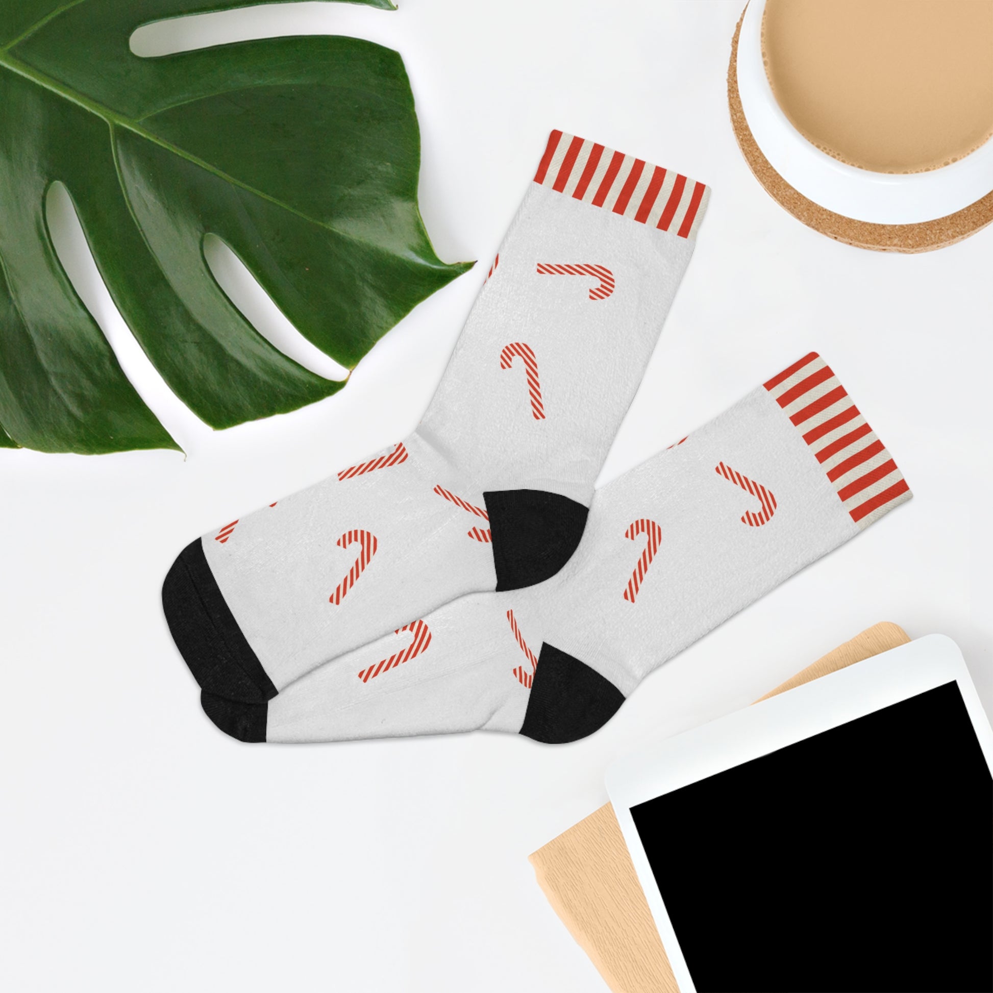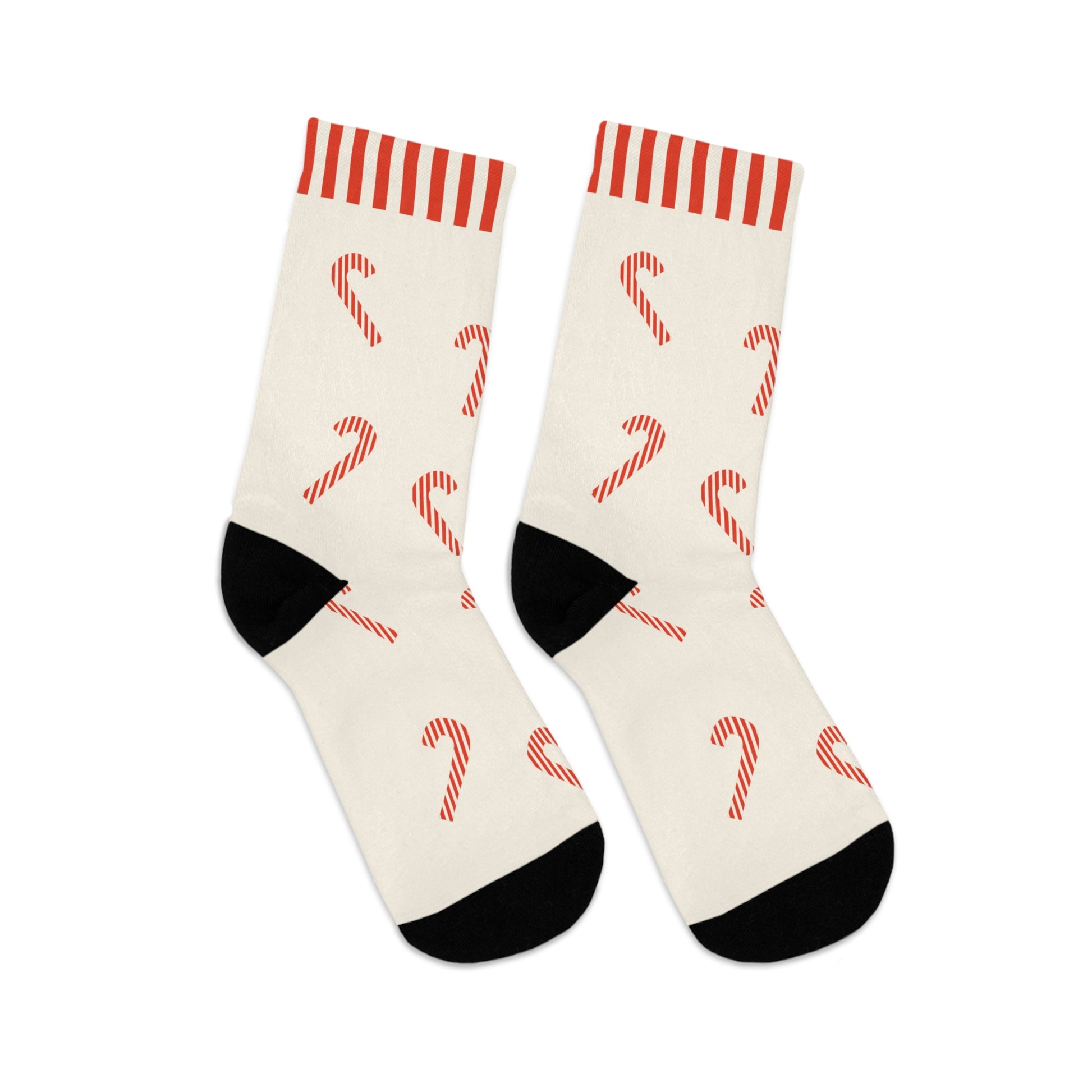 A festive Candy Cane Christmas Sock made from recycled polyester. One size fits all, making it a perfect holiday accessory for anyone looking to add some Christmas cheer to their outfit. Ideal for those who care about sustainability and enjoy unique, colorful designs. Perfect for Christmas celebrations and gifting.