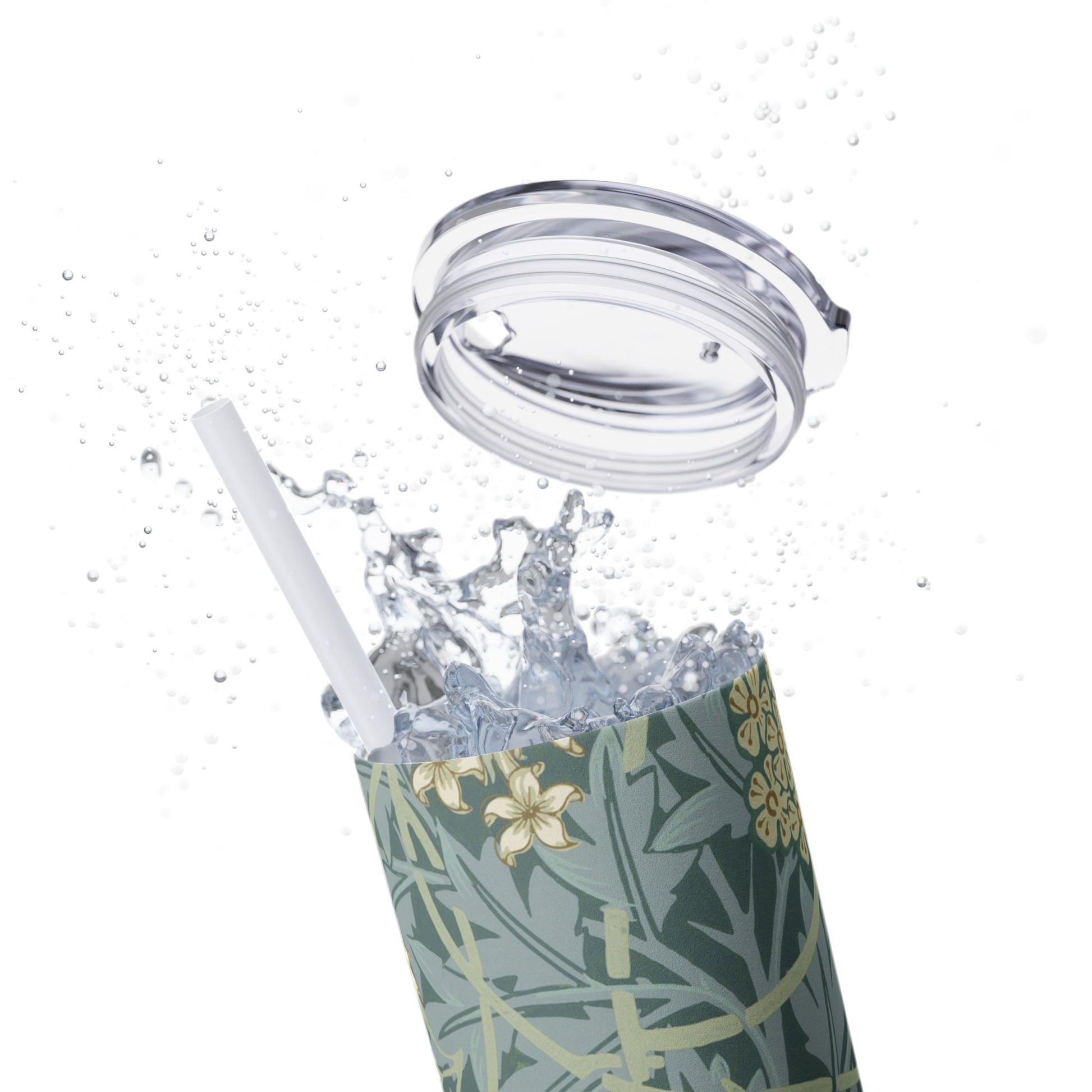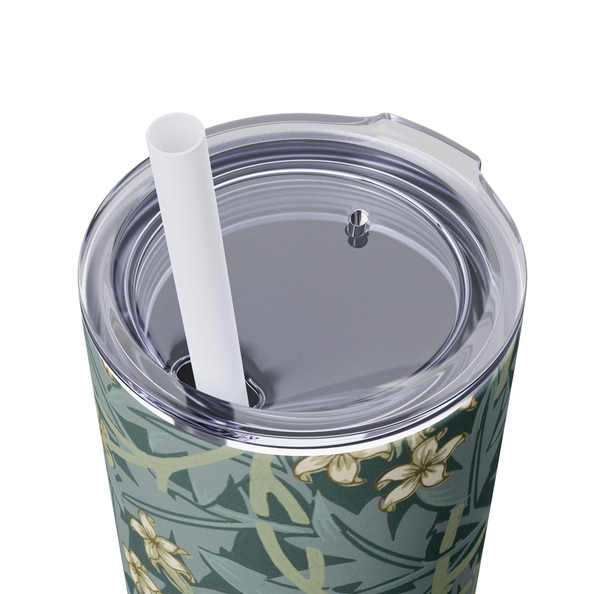 A slim insulated coffee cup with a straw featuring a William Morris floral design - Jane Austen approved! This tumbler exudes a classic and elegant vibe, ideal for enjoying your favorite beverages in style. It is perfect for those who appreciate vintage aesthetics making it a great gift for women of all ages. Suitable for everyday use on the go or special occasions like book club meetings or afternoon tea in the park.